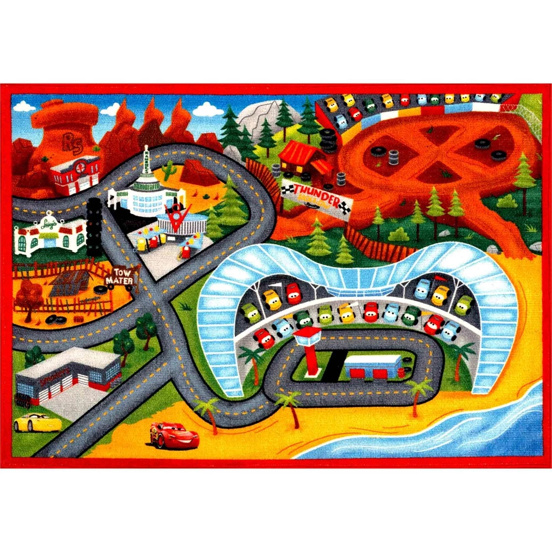 The Race for the Piston Cup continues . . . join Lightning McQueen on his newest adventures based on the hit Disney movie. Your little racer will spend hours playing with this interactive jumbo play rug featuring scenes from the Cars 3 movie. Start the journey from Radiator Springs to Thunder Hollow to finally arriving at the Florida 500 Winner’s Circle. Add your favorite Radiator Springs friends from your own collection to enhance this interactive experience. Jumbo rug measures 4 ft. 6 in. x 6 ft. 6 in. and is digitally printed providing great color and detail. Style: 46915.