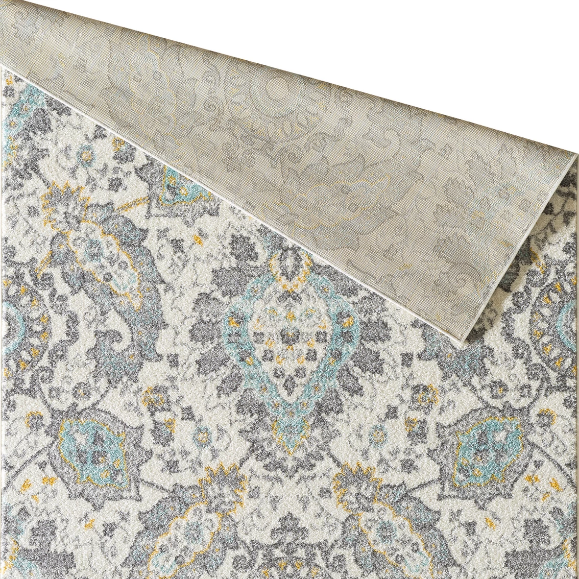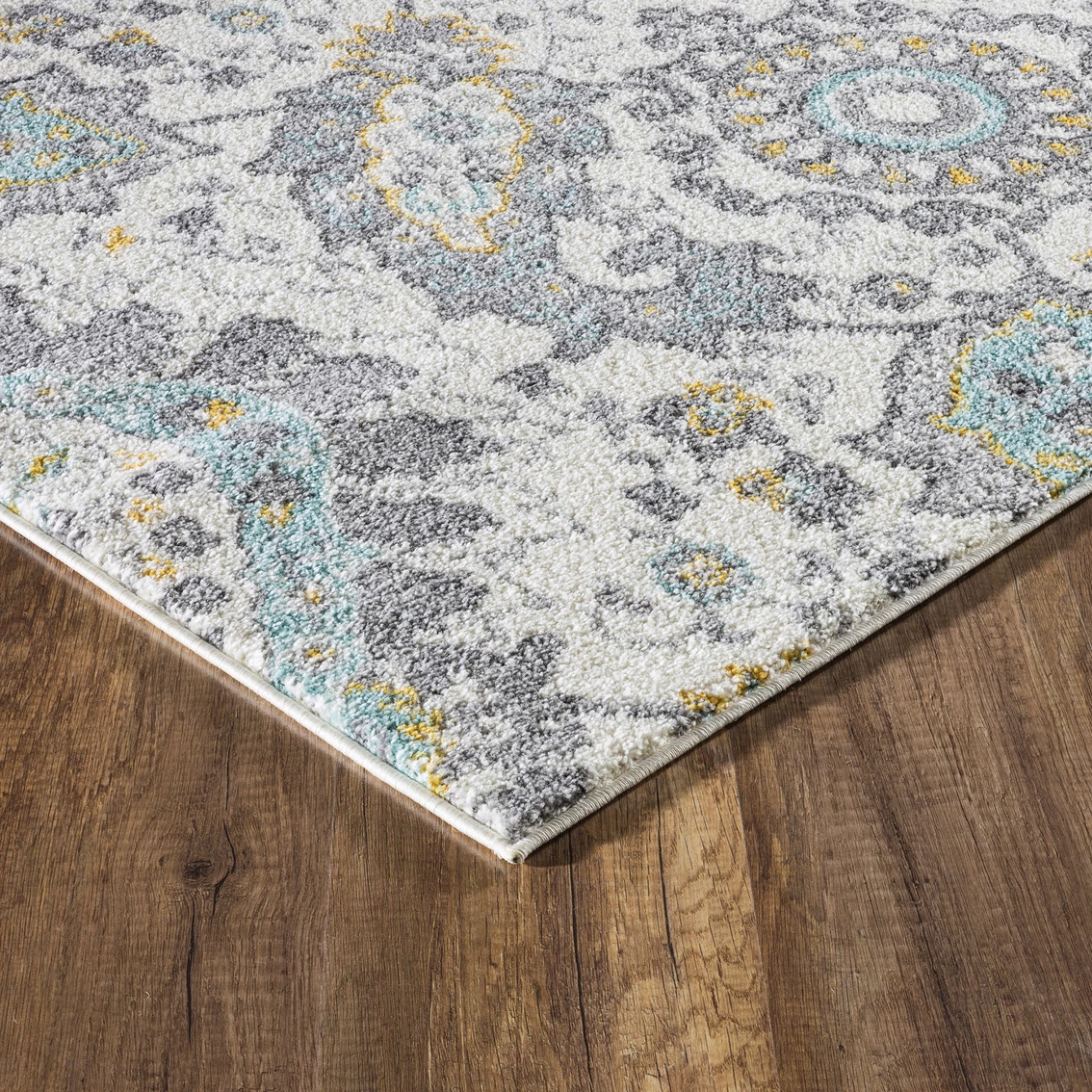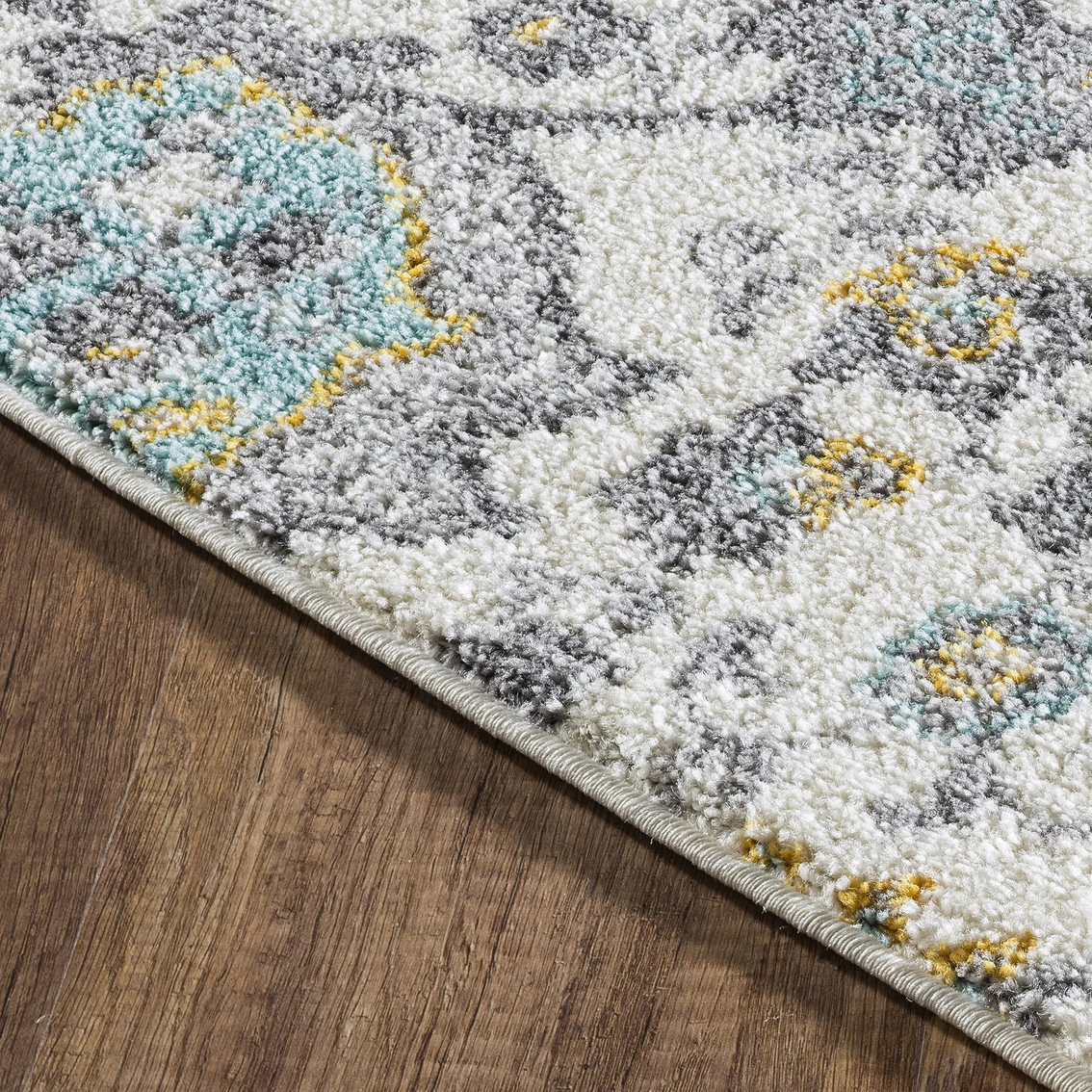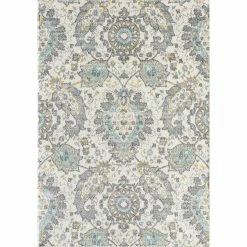 Inspired by the alluring aqua blue waters of Matira Beach, The L’Baiet Lula Boho Rug is well suited to the Matira Collection. The light grey and ivory background with intricate yellow hues inspires a springtime yet timeless feel in your home. The color combination plays well with warm wood flooring as well as cool white tiles. Made in Turkey, this area rug is constructed from heat-set polypropylene with a jute backing. The combination of these two materials make this rug soft, resistant to wear and tear and repel stains. Maintenance of this rug is made easy; animal hairs and lint don’t easily adhere to the fibers making vacuuming a breeze. Featuring a low pile height, this rug is ideal for areas with high foot traffic and ideal for placing under your living room furniture. For extra cushioning and traction underfoot, they recommend a rug pad. Although vintage inspired this bohemian style rug is ideal for promoting a cozy and inviting feel to your space wherever you may place it. Model: MT919B57.