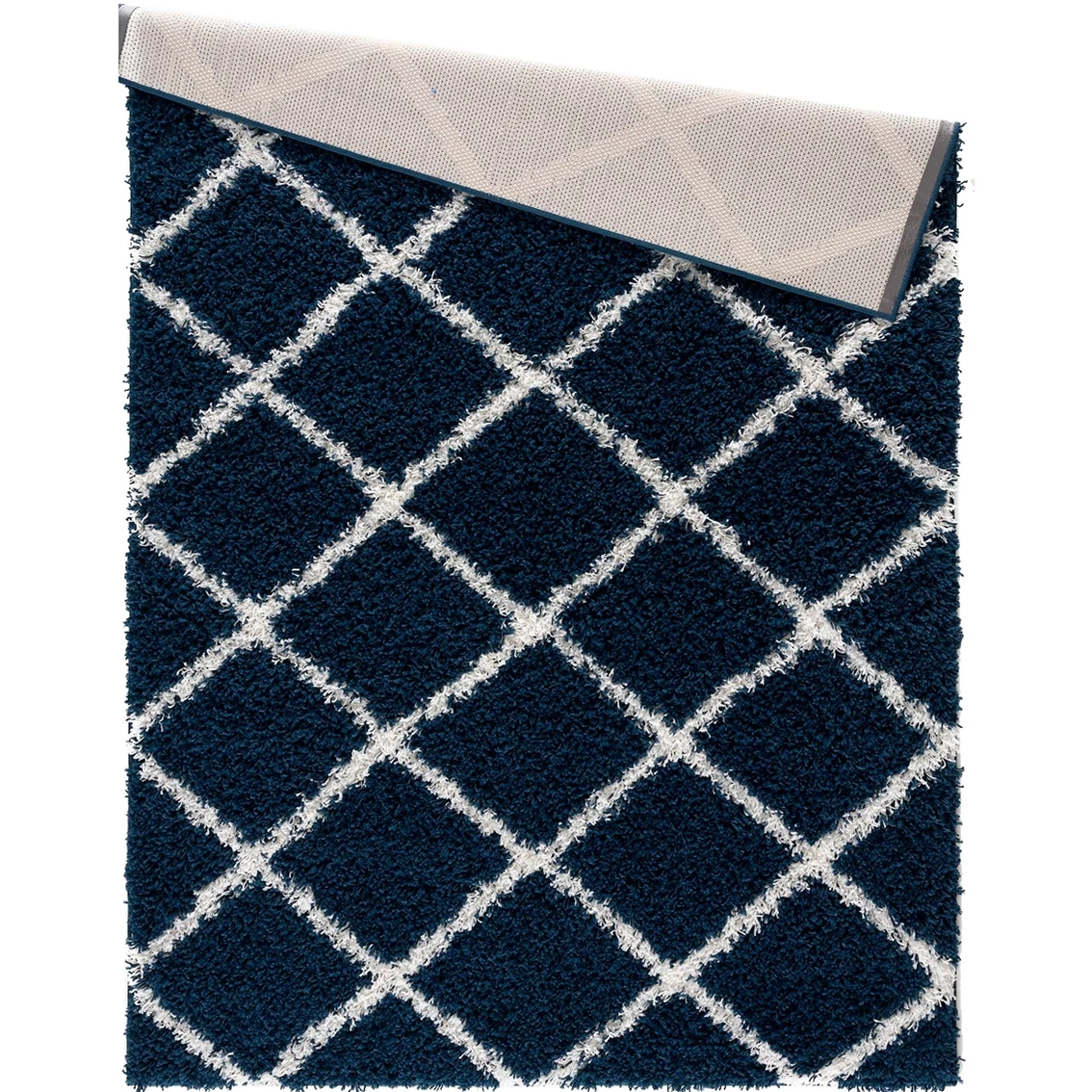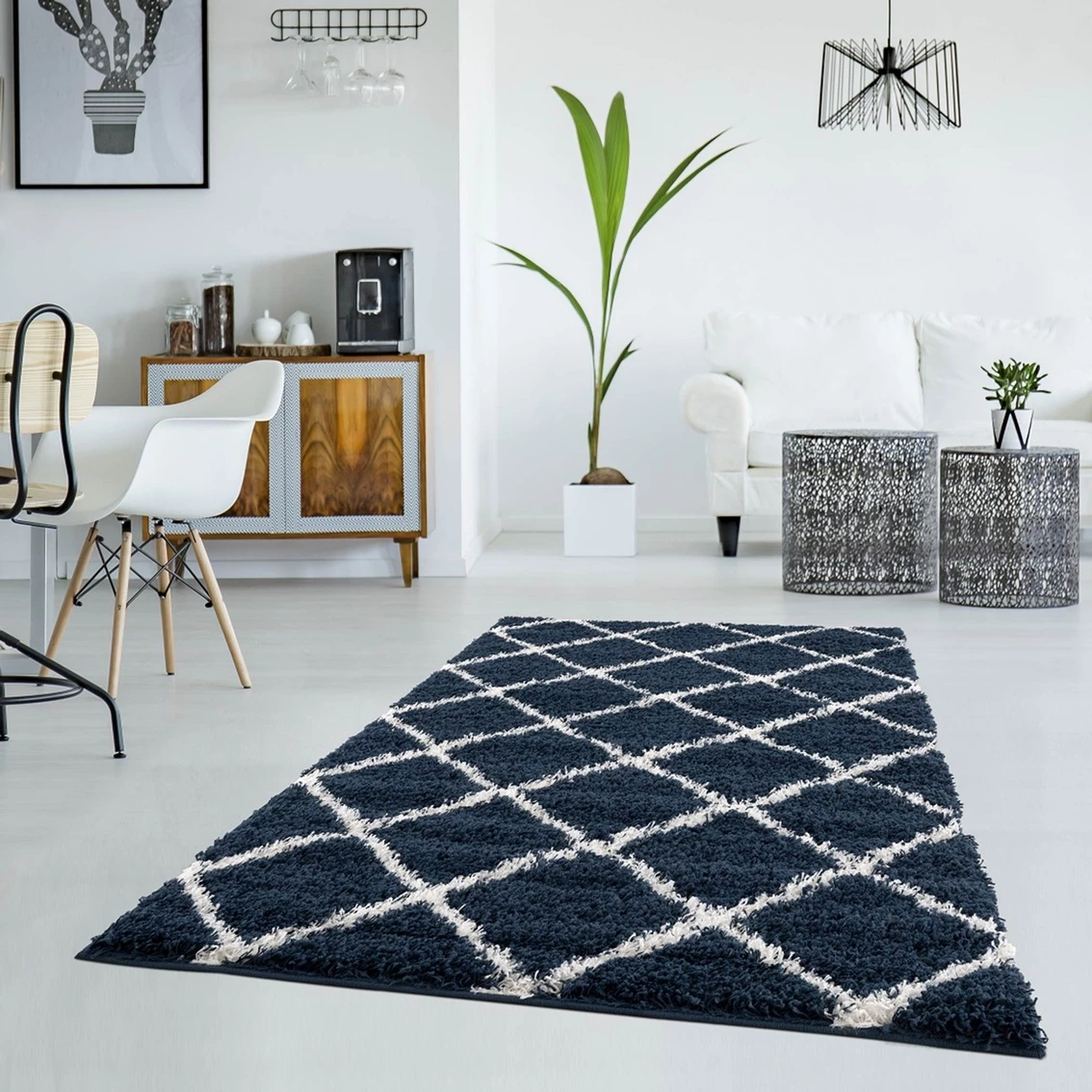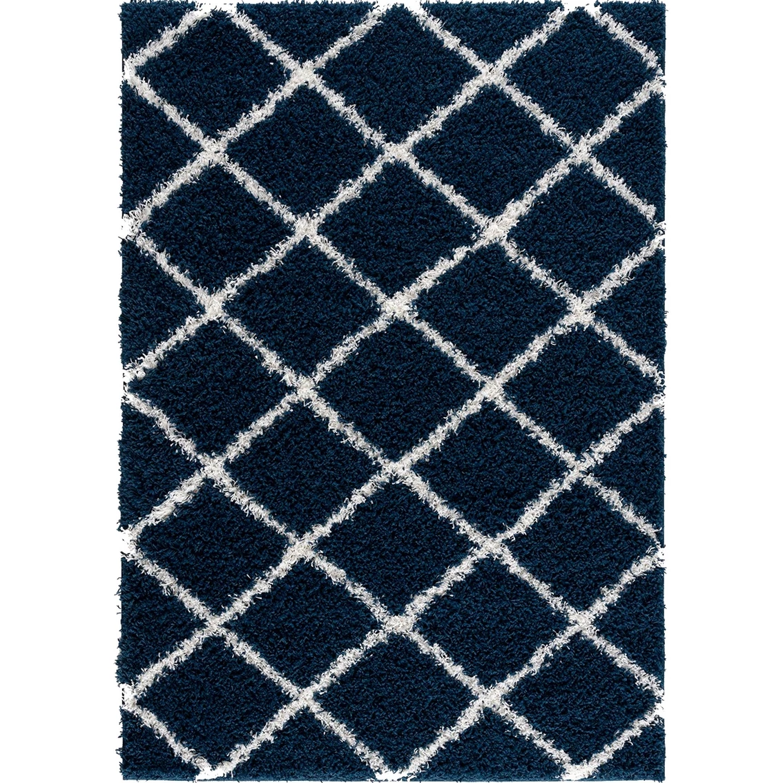 This is not your ordinary retro shag rug; The Phoenix Navy Shag Rug boost a diamond motif that is perfect for modern spaces yet its plush texture is suitable for cozy homes. It features a 2 inches pile height to encourage bare feet to sink their toes in it and enjoy the comfort.