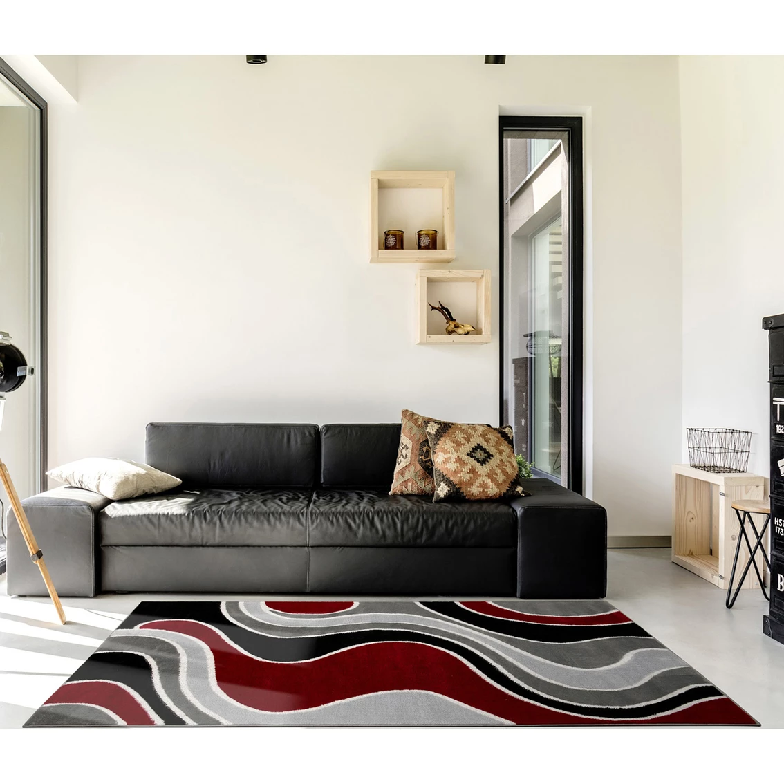 Draw the eyes downward with the Sian Multicolor Graphic Rug. This bold retro-inspired rug from the Solana Collection by L’Baiet blends well with both Modern and Contemporary room decors. Its abstract wavy design is comprised of primary colors such as red, white and black suitable for living spaces that embrace color block schemes. Machine made in Turkey, this rug is power-loomed of stain and fade resistant polypropylene in a low 0.43 in. pile height perfect for rolling out in fashionable living rooms and dining spaces. Complete with a durable polyester backing, this area rug performs best when paired with a rug pad to prevent shifting and sliding. Adding a rug is an affordable option for lending your space an eye-catching accent while also protecting your hardwood or tile floors. Model: SL148M.
