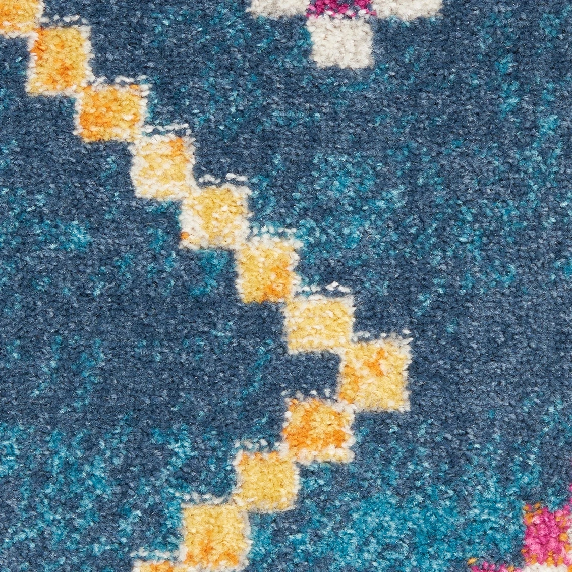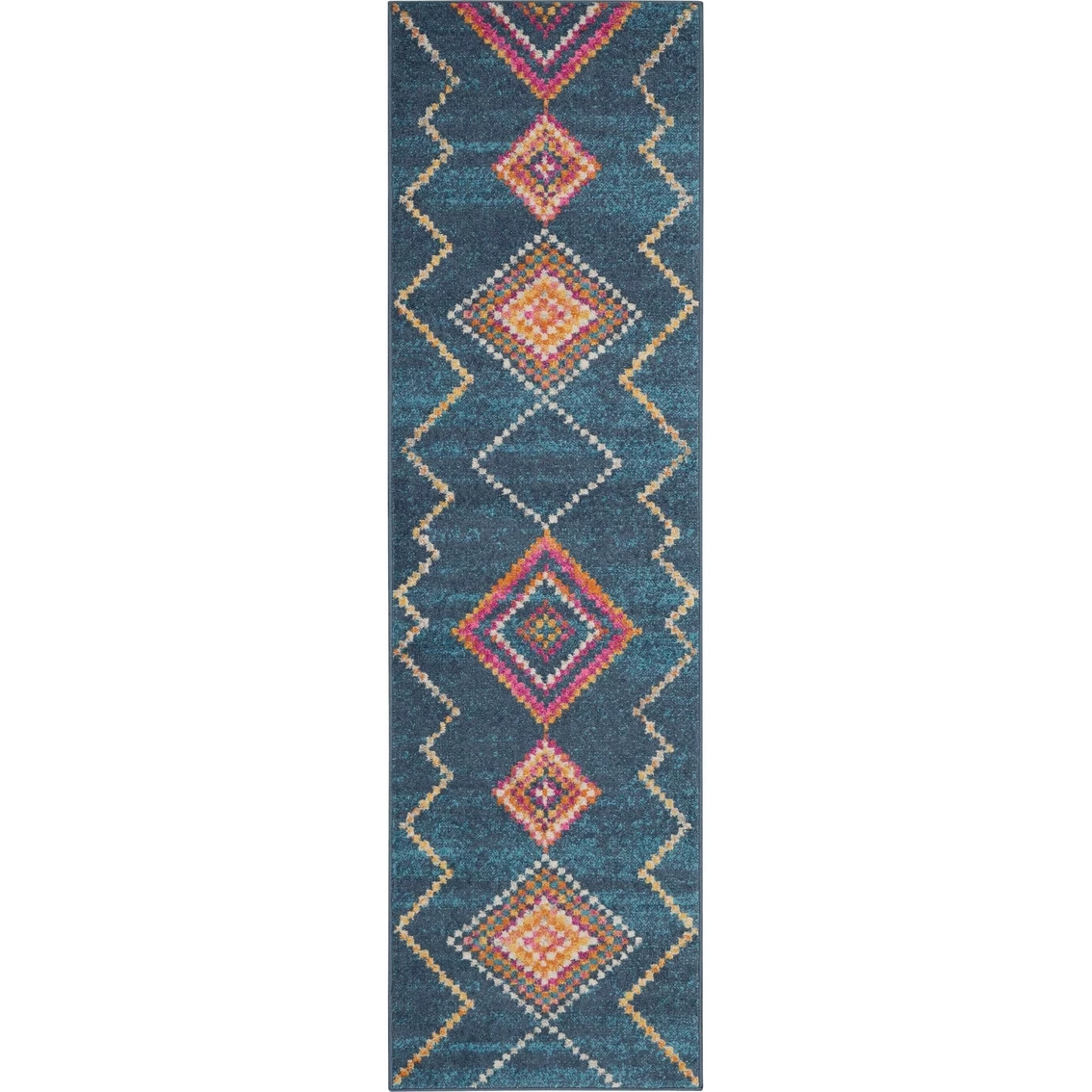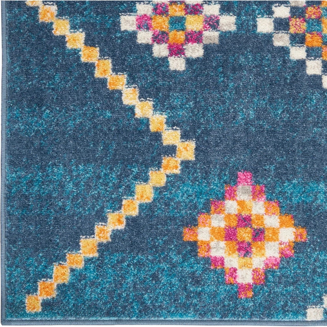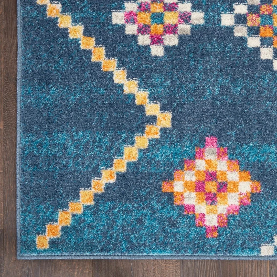 Its richly colored teal blue ground makes the vibrantly colored geometric and diamond patterns of this stand out beautifully in your living room, bedroom, dining room, or home office.