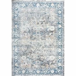 This 5 ft. 3 in. x 7 ft. 6 in. Blue Border Area Rug Area Rug from the Rizzy Home Bristol collection is power loomed in Turkey using easy-to-care-for polypropylene and accented with touches of shimmering polyester. Using a color combination of a beige backfield that is just right, not too white, not too yellow, the accents of copper and gray blue create a look that is stunning and unique! A quality rug pad is recommended.