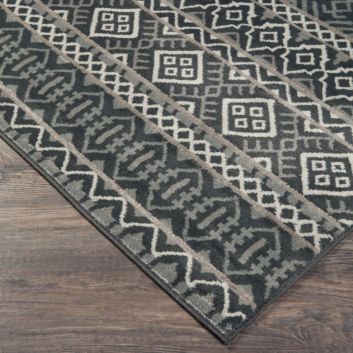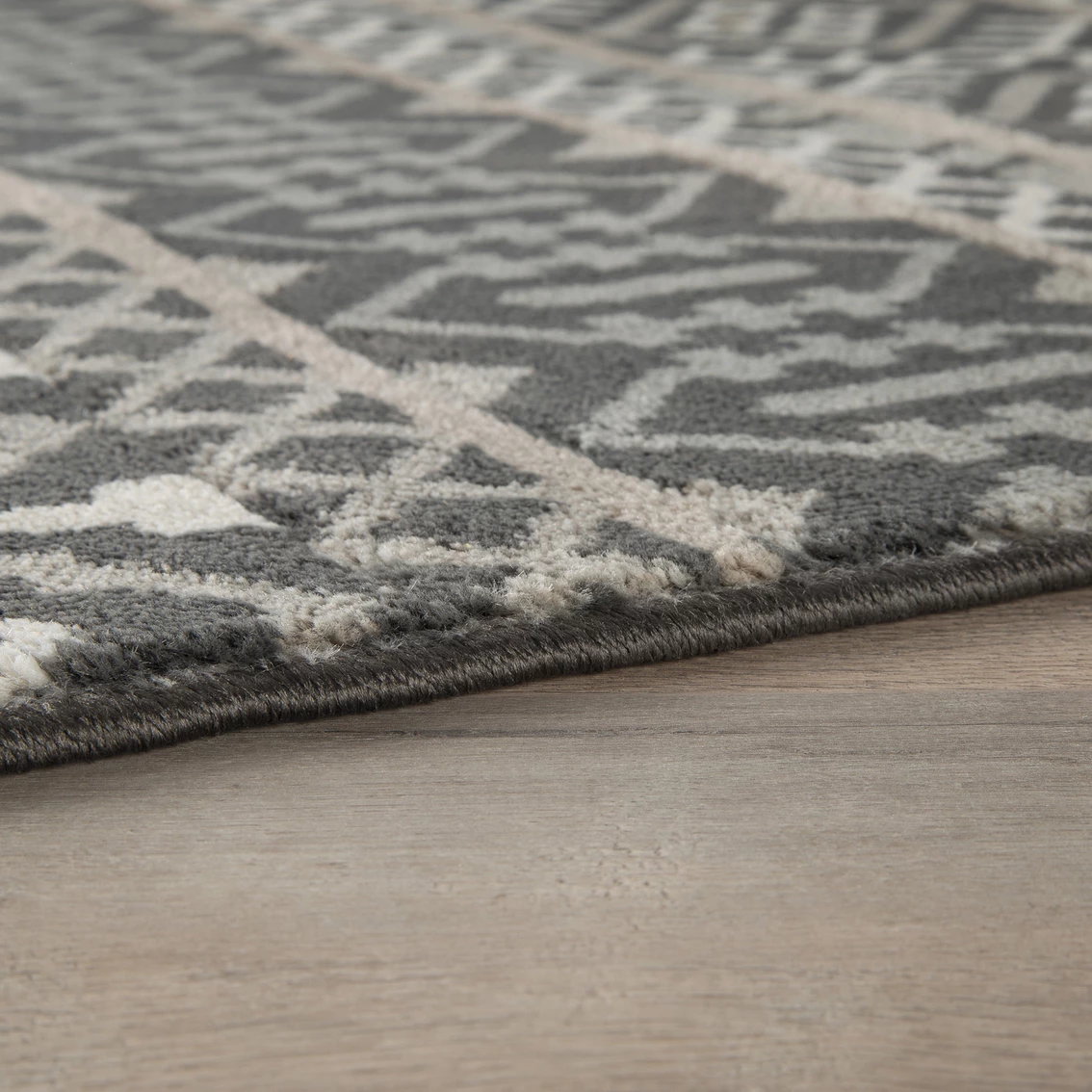 Add classic beauty to any space with the Joachim Accent Rug from Signature Design by Ashley. Machine made polypropylene rug measures 7.25 x 5 ft. with a mixed media pattern in black and white. Rug has an 8mm pile and is spot clean only. Rug pad recommended. Model: R403152.