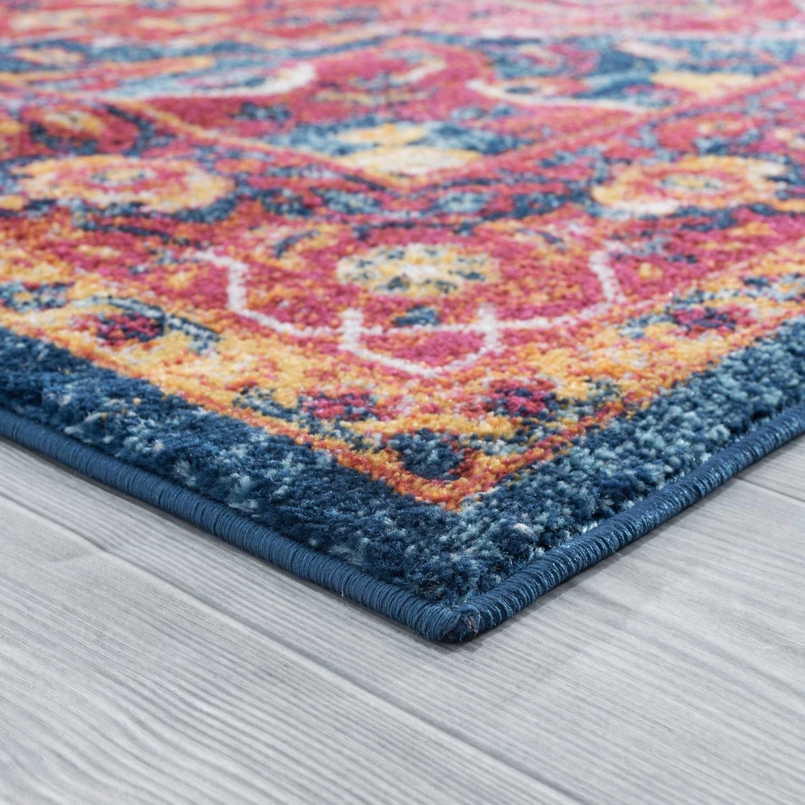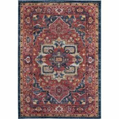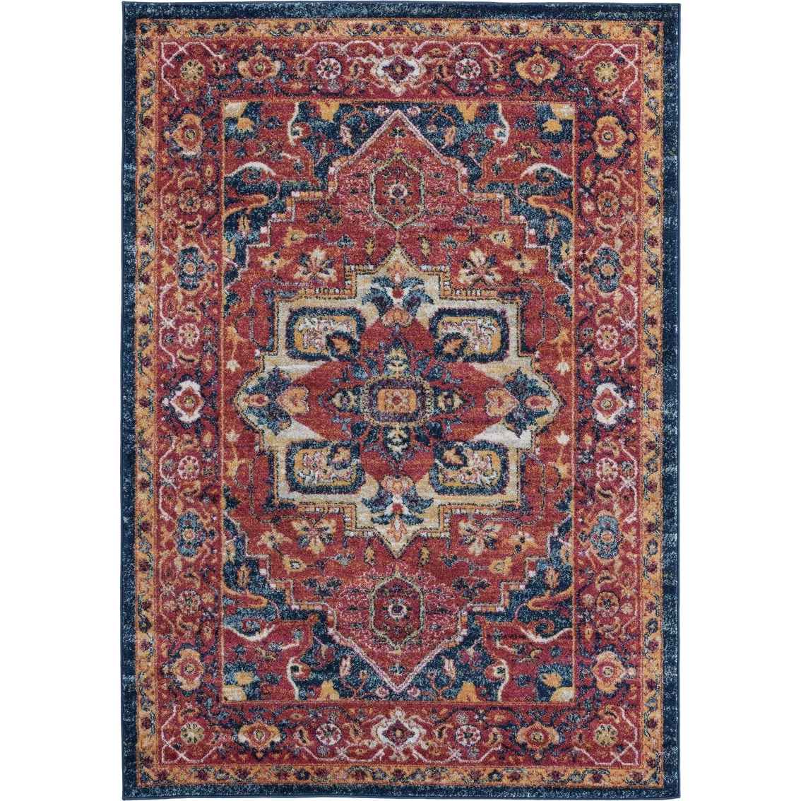 This exotic Bali Arubia area rug from United Weavers will be the highlight of your room. Shades of dark blues and deep pinks with pops of yellow will brighten your interior design. Along with a designer look and feel, this machine-made rug is made for long lasting durability.