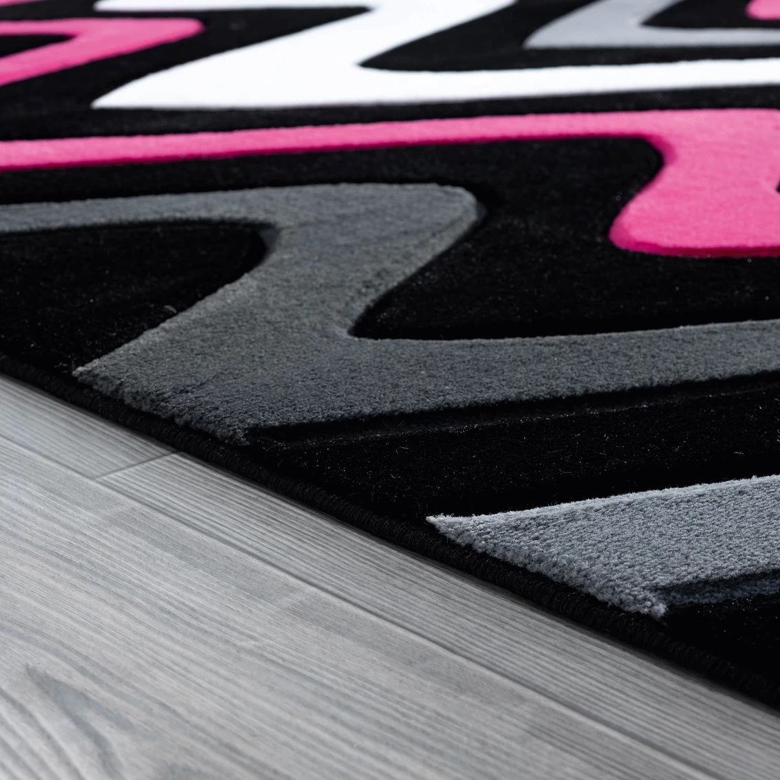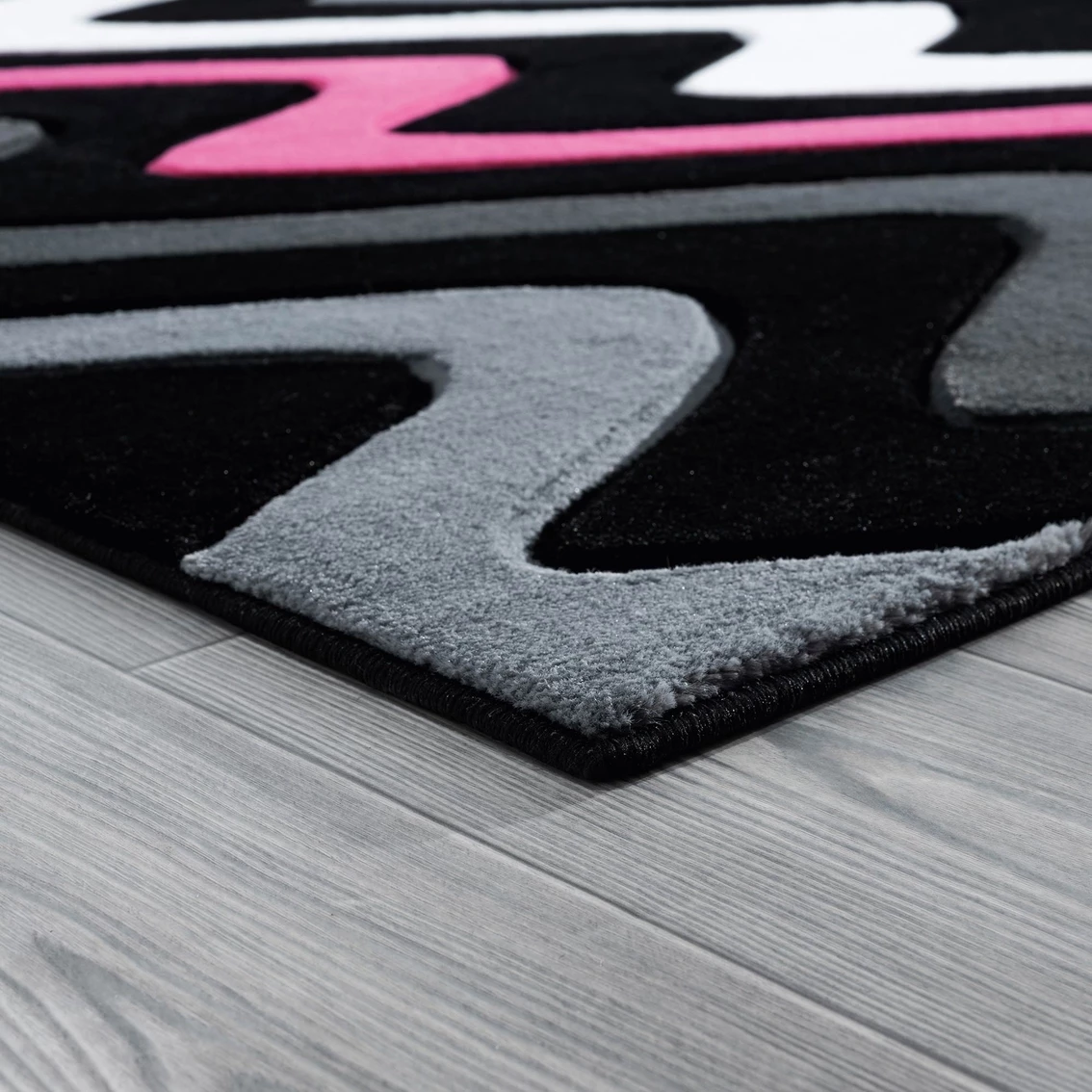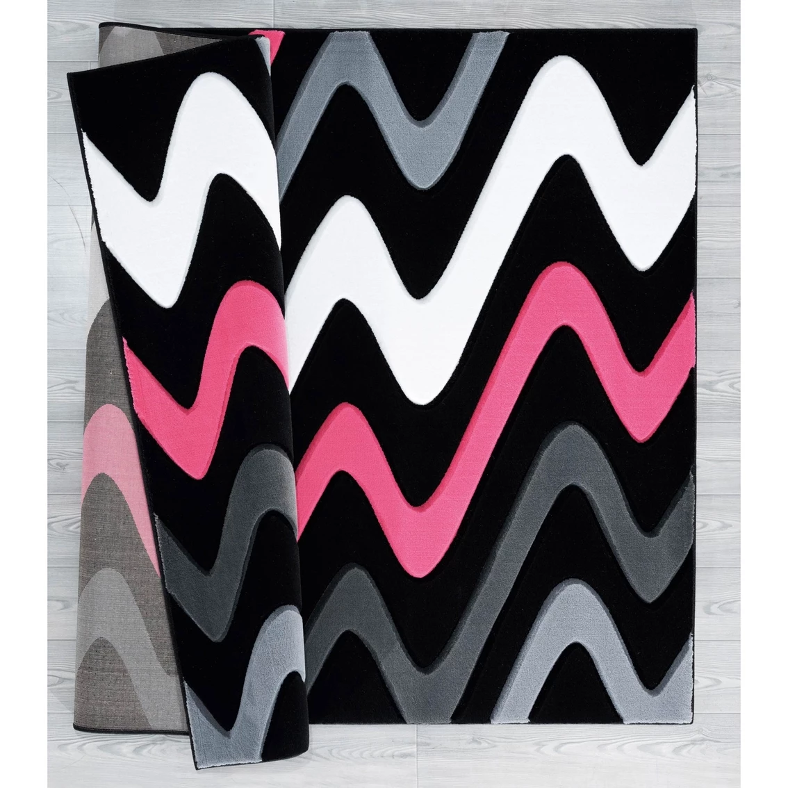 Add a vibrant and fun touch into any room with this spunky rug from United Weavers. Squiggly lines of bright pink, smoke grey and pure white pop out against the jet-black backdrop that will add a unique accent to your décor. This machine-made rug has a hand carved design and is stain and fade resistant for your lifestyle needs. High-quality polypropylene/olefin for shine. Hand-carved in Turkey, giving durability and strength. Available in multiple colors and sizes. Vacuum regularly without beater bar. Plush pile height for added softness. Great for high traffic areas. Model: 2050-11186.