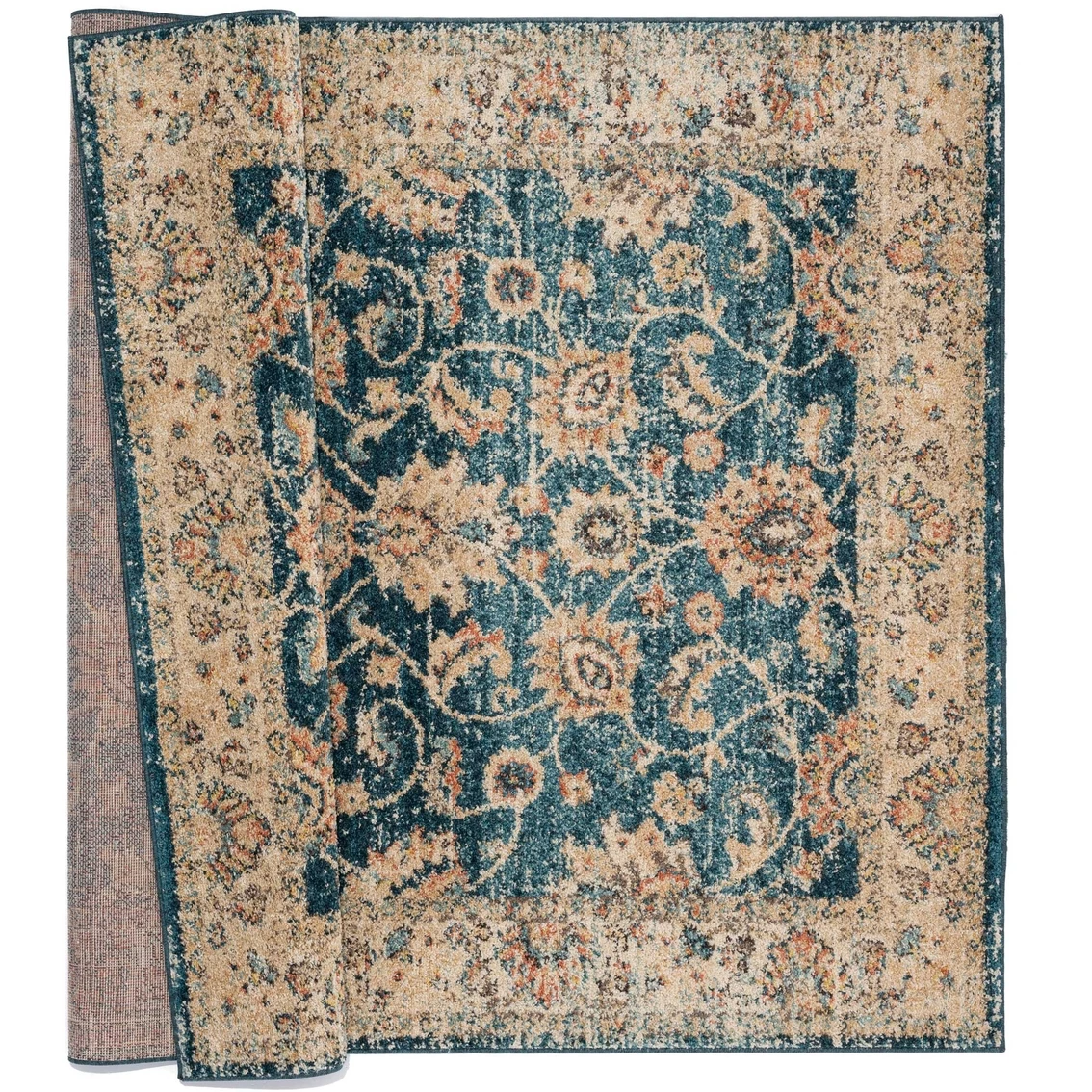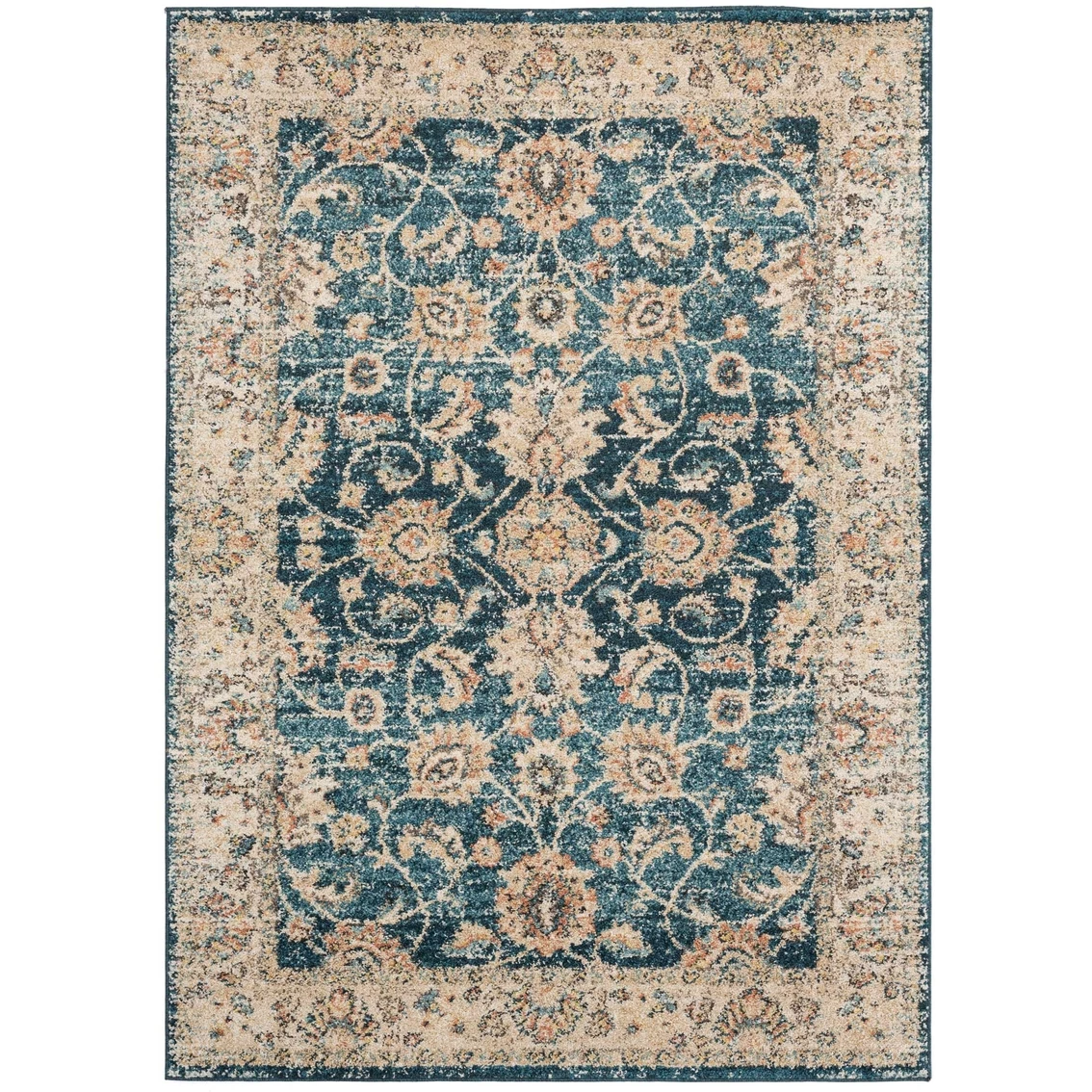 Provide a luxurious appeal to your interior design with this chic transitional rug. This ornate piece creates a beautiful affect by using shades of gold on a beautiful cerulean blue backdrop to bring out the intricate detailing in this marvelous design. Machine made in Turkey with polypropylene yarn for stain resistance and lasting durability.