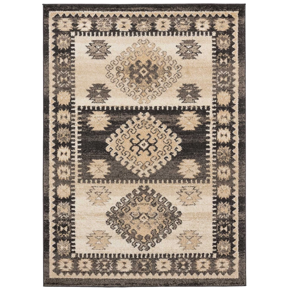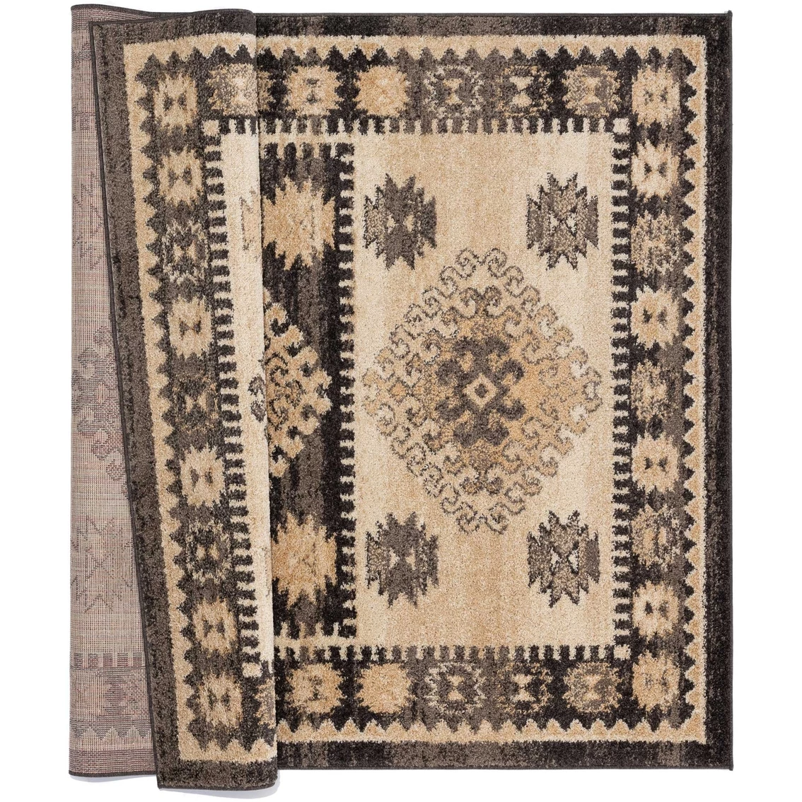 Strengthen your decorative layout with this beautiful southwestern rug. Using hues of walnut brown and onyx black and an elaborate edging, this polished rug will give any space a sense of elegance. Machine made in Turkey with polypropylene yarn for stain resistance and lasting durability.