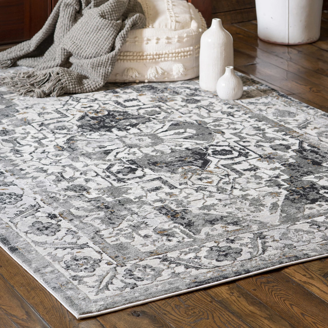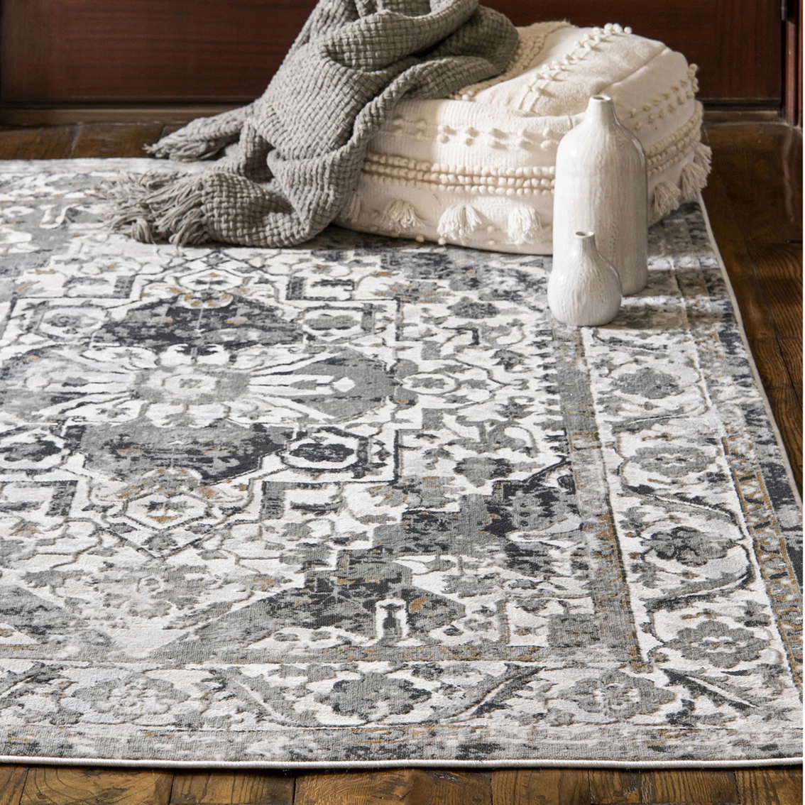 High-quality polyester for shine. Power-loomed in Turkey, giving durability and strength. Available in multiple colors and sizes. Vacuum regularly without beater bar. Plush pile height for added softness. 10×13 and 12×15 sizes ship folded in a box. Any fold marks or creases will relax after several days. Great for high traffic areas. Model: 2610-20691-58.